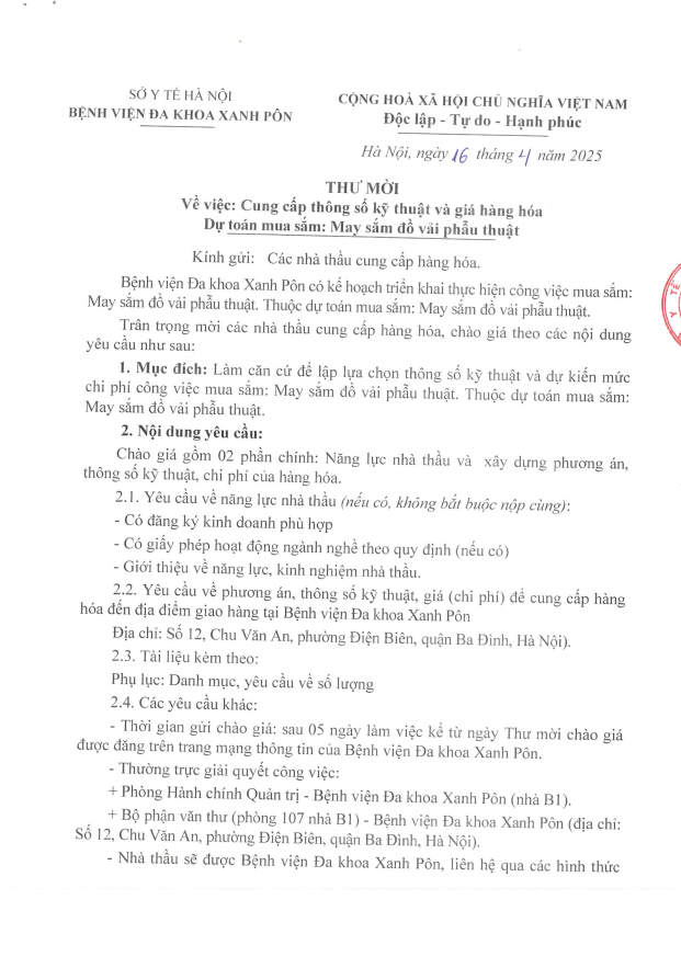 Chào giá may sắm đồ vải phẫu thuật 16-4-2025