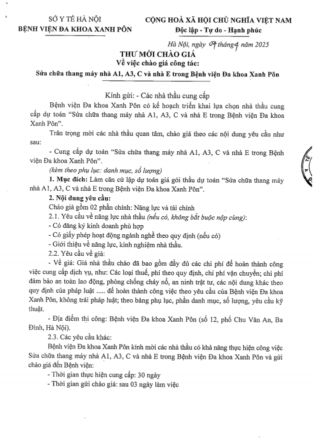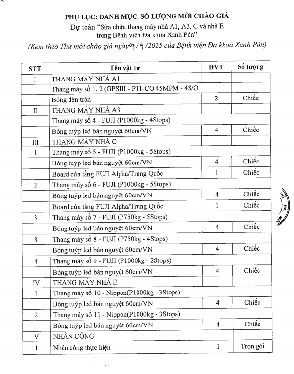 Chào giá sửa chữa thang máy nhà A1,A3,C và E 4-4-2025