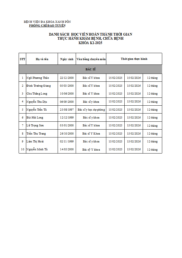 Bệnh viện Đa khoa Xanh Pôn thông báo danh sách người đã hoàn thành thời gian thực hành khám bệnh, chữa bệnh kể từ khi được duyệt công bố và tổ chức thực hành của khóa K3-2025 hoàn thành trong Quí I năm 2026.