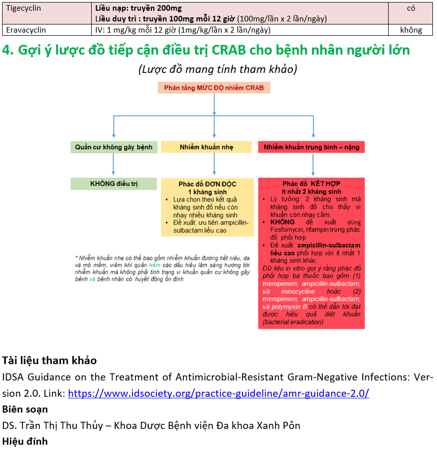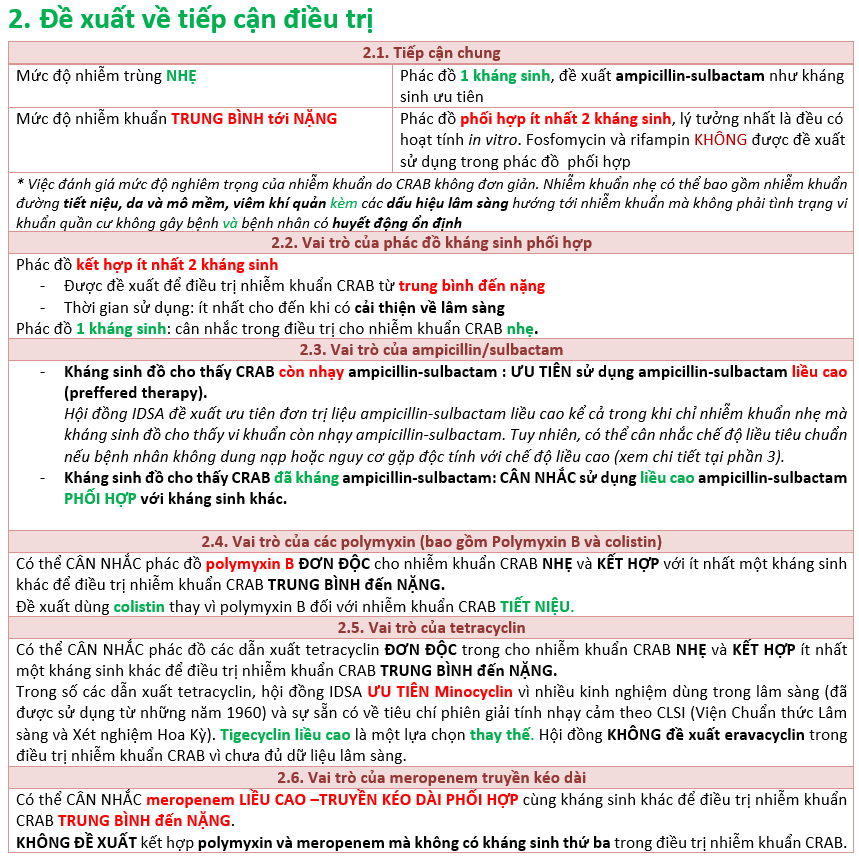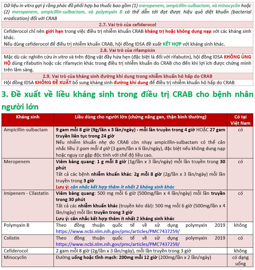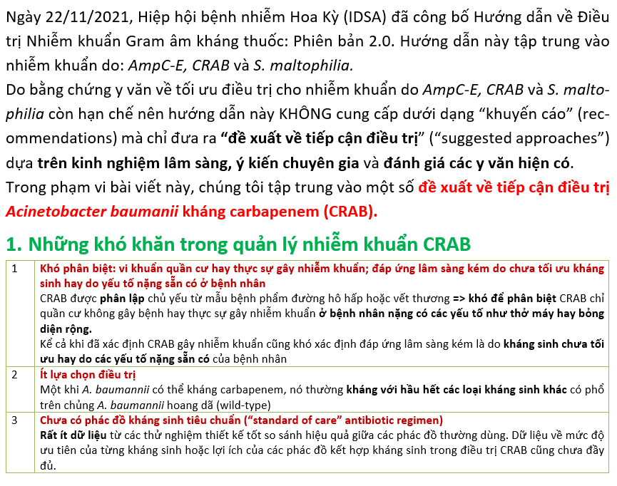 Đề xuất về tiếp cận điều trị nhiễm khuẩn do Acinetobacter baumanii kháng carbapenem (CRAB) cập nhật Hướng dẫn IDSA 2021