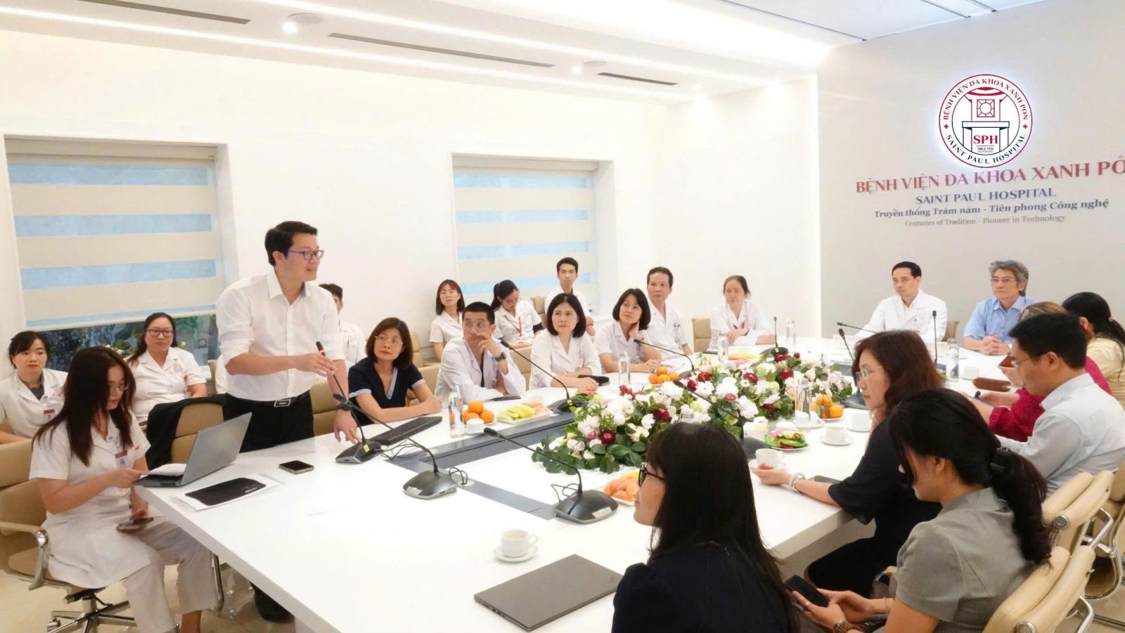 Hội nghị đã nghe báo cáo tổng kết chương trình hợp tác Viện – Trường với nhiều kết quả nổi bật trong đào tạo thực hành, nghiên cứu khoa học và triển khai hoạt động chuyên môn, công tác quản lý kinh tế dược... Trong 5 năm vừa qua, chương trình đã tích cực thúc đẩy hợp tác quốc tế nhằm phát triển chuyên sâu theo hướng chuẩn hóa và hiện đại với sự hỗ trợ thường xuyên, liên tục của các chuyên gia quốc tế đến từ Đại học California (GS.TS. Jennifer Le, GS.TS. Amy Sitapati...); Đại học Illinois Chicago (GS.TS. Alan Lau, TS. Keri Kim...); Đại học Minnesota (PGS. Elizabeth Hirsch...); Đại học Claude Bernard Lyon 1 (GS.TS.Marie-Geneviève Dijoux-Franca..)... Qua đó, chương trình đã có những đóng góp sâu rộng trong việc xây dựng mô hình thực hành lâm sàng hiệu quả cũng như hỗ trợ các dược sĩ của Bệnh viện Đa khoa Xanh Pôn tham gia vào sân chơi quốc tế. Chiến lược này không chỉ góp phần nâng cao năng lực chuyên môn, mà còn tạo nền tảng vững chắc cho việc hội nhập quốc tế của bệnh viện Đa khoa Xanh Pôn trong lĩnh vực Dược.