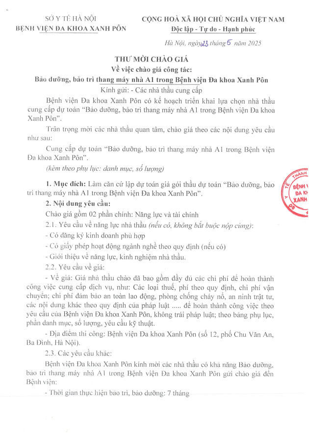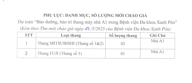 Mời chào giá bảo dưỡng thang máy nhà A1 23-5-2025