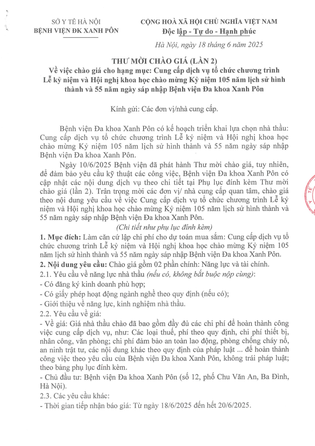Mời chào giá cho các hạng mục tổ chức Lễ kỷ niệm 105 năm (lần 2) 18-6-2025