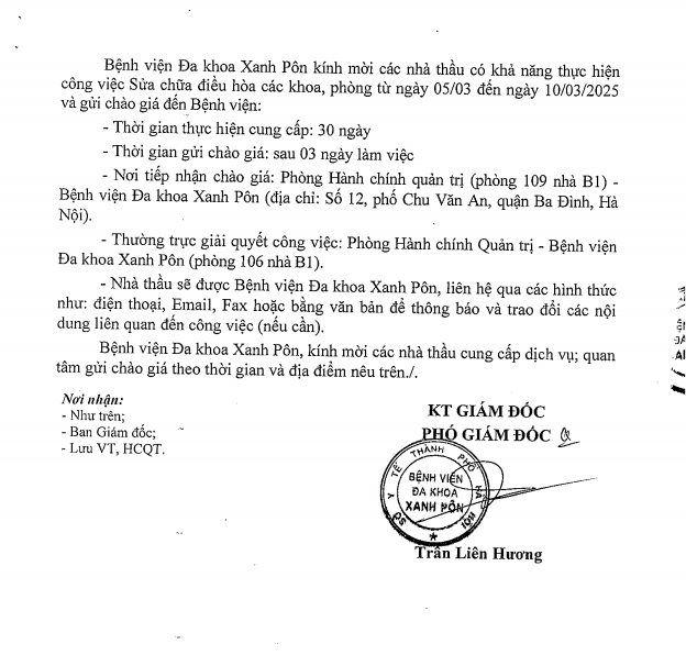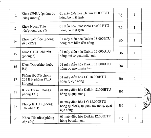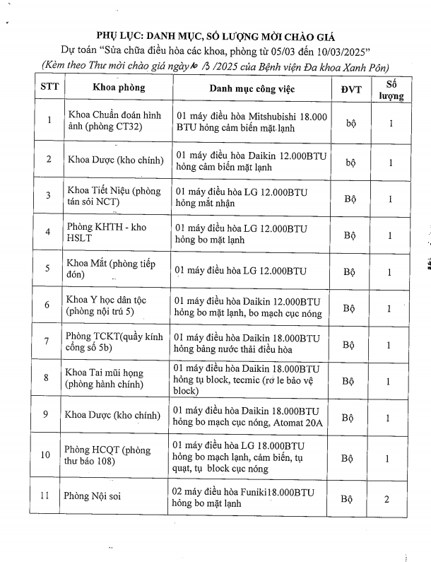 Mời chào giá công tác sửa chữa điều hòa các khoa từ ngày 5-3 đến 10-3-2025