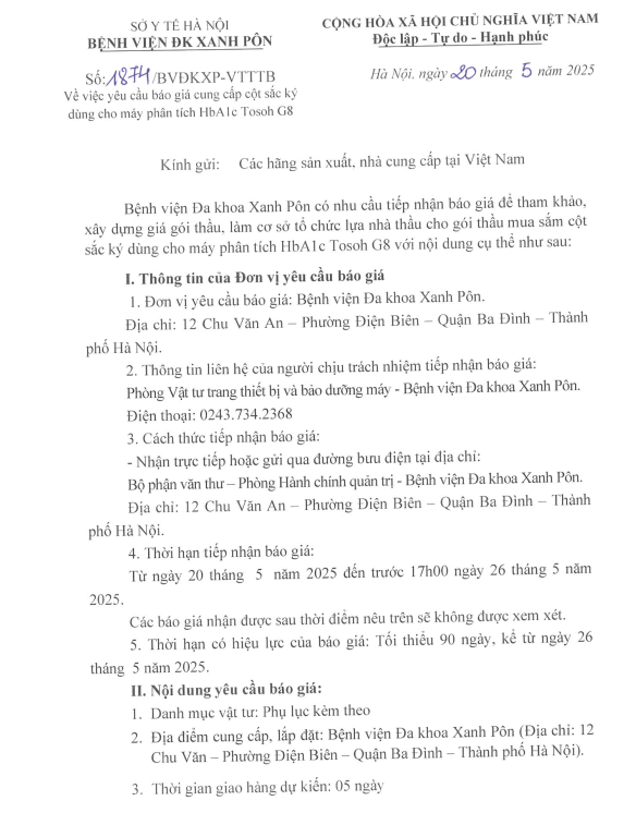 Mời chào giá cung cấp cột sắc ký dùng cho máy phân tích HbA1c 1874-2025