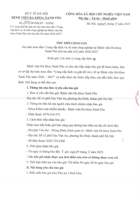 Mời chào giá - Cung cấp dịch vụ vệ sinh công nghiệp (trừ tòa A2) năm 2026-2027 -CV 2809