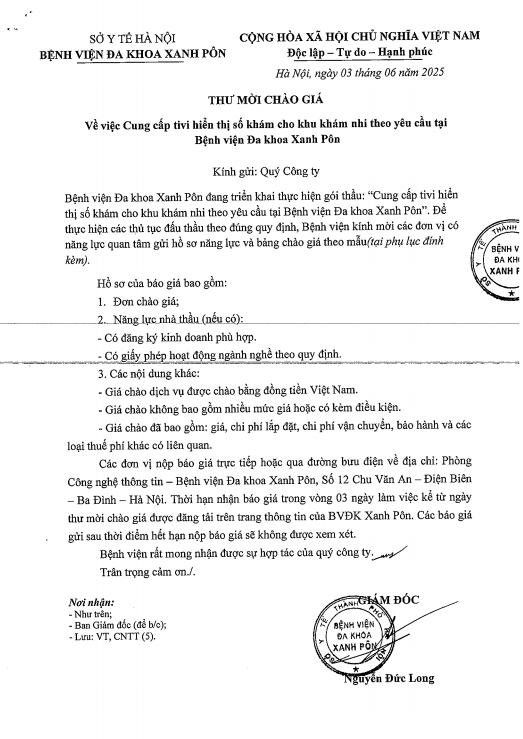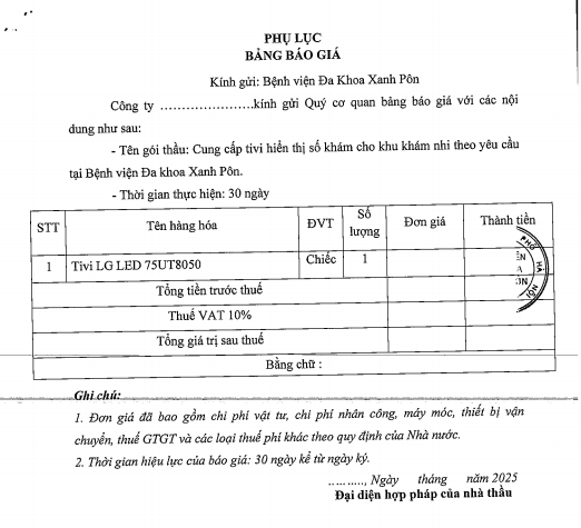 Mời chào giá cung cấp ti vi hiển thị số khám cho khu khám nhi theo yêu cầu 03-06-2025
