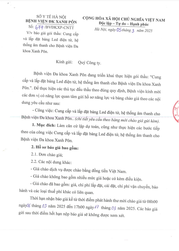 Mời chào giá: cung cấp và lắp đặt bảng Led điện tử, hệ thống âm thanh - CV677 - 2025