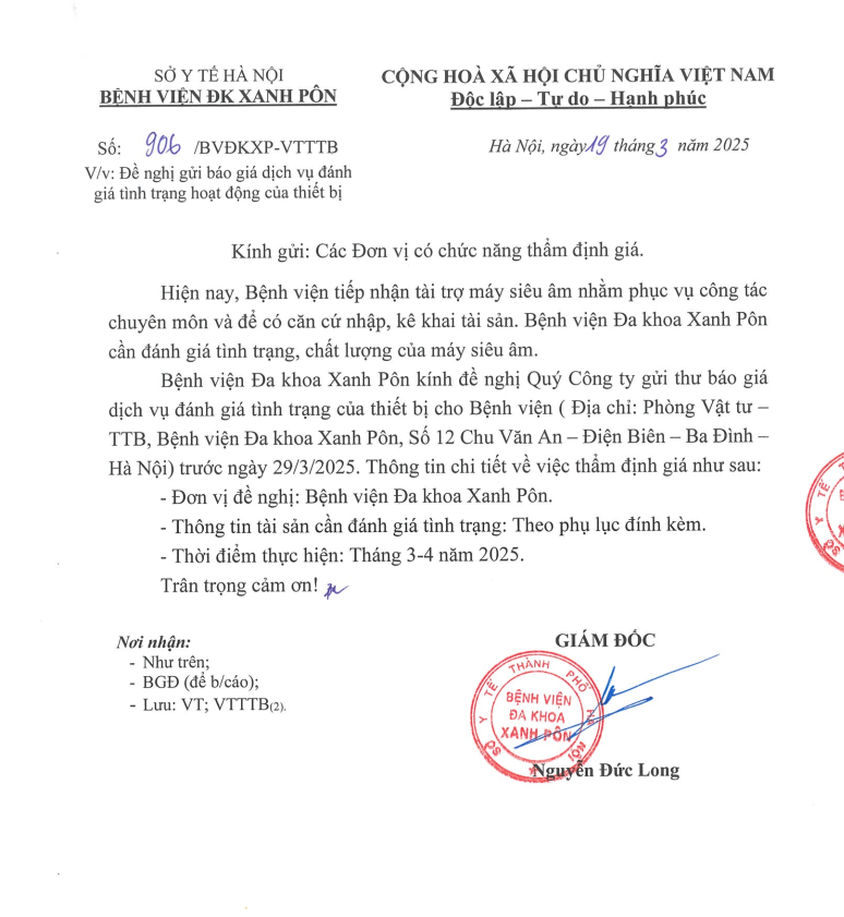 Hôm nay tôi mạnh dạn viết thư này đầu tiên tôi cảm ơn BLĐ Bệnh viện Xanh Pôn đã đào tạo được các BS có tâm huyết như các BS 2 khoa trên và cho tôi gửi lời cảm ơn đến các BS và mong BV Xanh Pôn sẽ còn nhiều BS như thế nữa. Đúng như lời Bác Hồ dạy 'Lương y như mẹ hiền' Xin chân thành cảm ơn BV