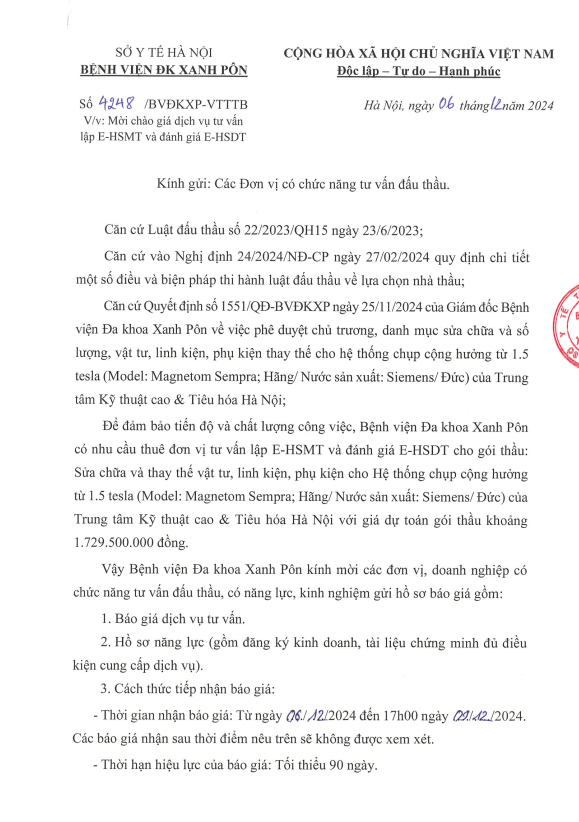 Mời chào giá dịch vụ lập E_HSMT và đánh giá E_HSDT 4248-2024