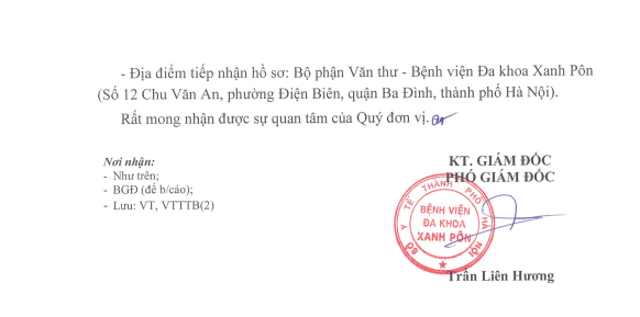 Hôm nay tôi mạnh dạn viết thư này đầu tiên tôi cảm ơn BLĐ Bệnh viện Xanh Pôn đã đào tạo được các BS có tâm huyết như các BS 2 khoa trên và cho tôi gửi lời cảm ơn đến các BS và mong BV Xanh Pôn sẽ còn nhiều BS như thế nữa. Đúng như lời Bác Hồ dạy 'Lương y như mẹ hiền' Xin chân thành cảm ơn BV