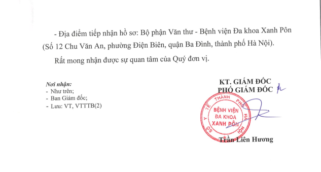 Hôm nay tôi mạnh dạn viết thư này đầu tiên tôi cảm ơn BLĐ Bệnh viện Xanh Pôn đã đào tạo được các BS có tâm huyết như các BS 2 khoa trên và cho tôi gửi lời cảm ơn đến các BS và mong BV Xanh Pôn sẽ còn nhiều BS như thế nữa. Đúng như lời Bác Hồ dạy 'Lương y như mẹ hiền' Xin chân thành cảm ơn BV