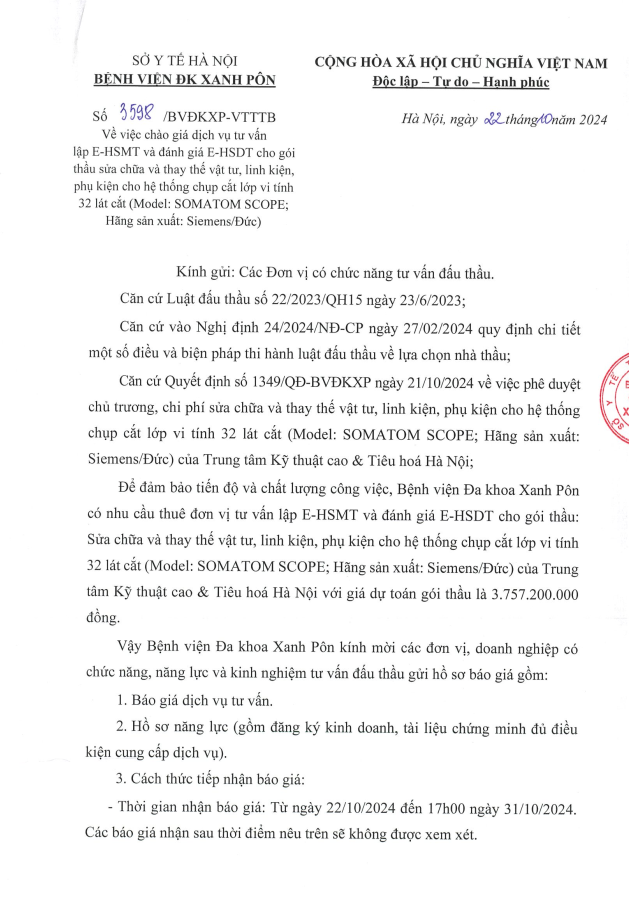 Mời chào giá dịch vụ tư vấn lập E-HSMT và đánh giá E-HSDT 3598-2024