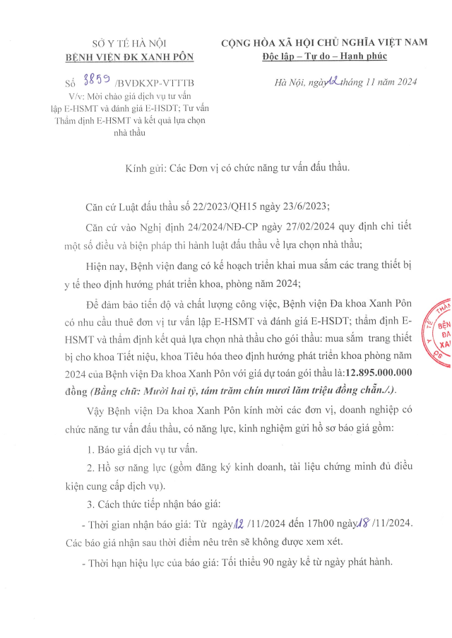 Mời chào giá dịch vụ tư vấn lập E-HSMT và đánh giá E-HSDT 3859-2024