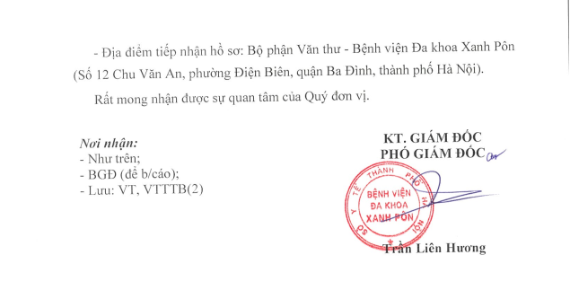 Hôm nay tôi mạnh dạn viết thư này đầu tiên tôi cảm ơn BLĐ Bệnh viện Xanh Pôn đã đào tạo được các BS có tâm huyết như các BS 2 khoa trên và cho tôi gửi lời cảm ơn đến các BS và mong BV Xanh Pôn sẽ còn nhiều BS như thế nữa. Đúng như lời Bác Hồ dạy 'Lương y như mẹ hiền' Xin chân thành cảm ơn BV