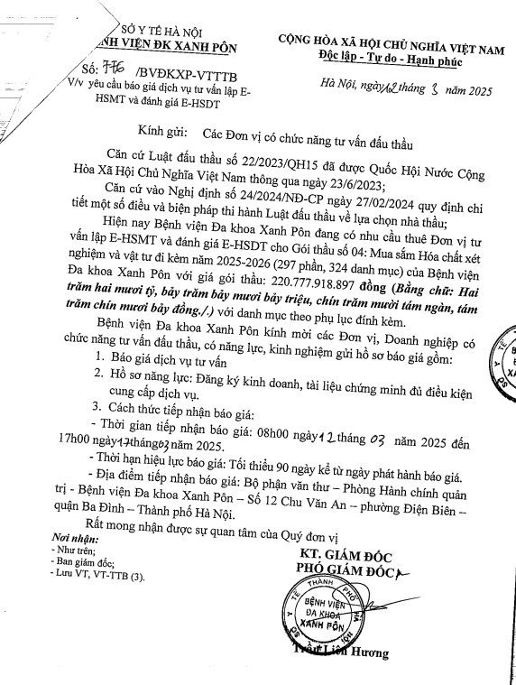 Mời chào giá dịch vụ tư vấn lập E-HSMT và đánh giá E-HSDT 776-2025