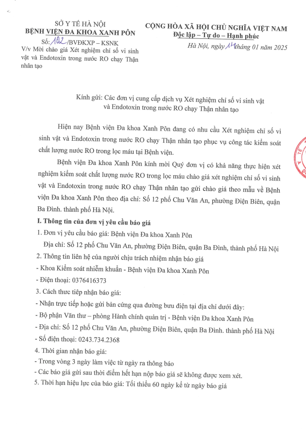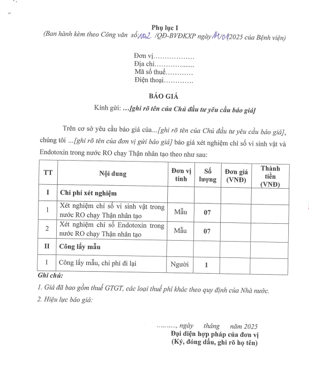 Mời chào giá dịch vụ xét nghiệm chỉ số vi sinh và Endotoxin 102-2025