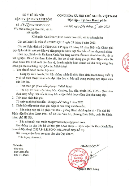 Mời chào giá hóa chất, vật tư xét nghiệm 1726-2025