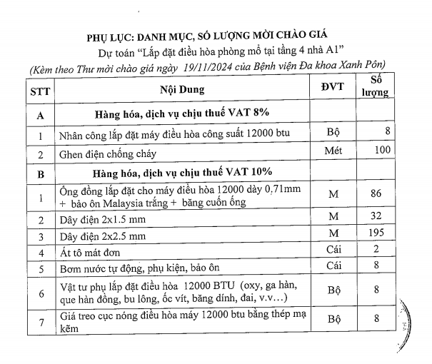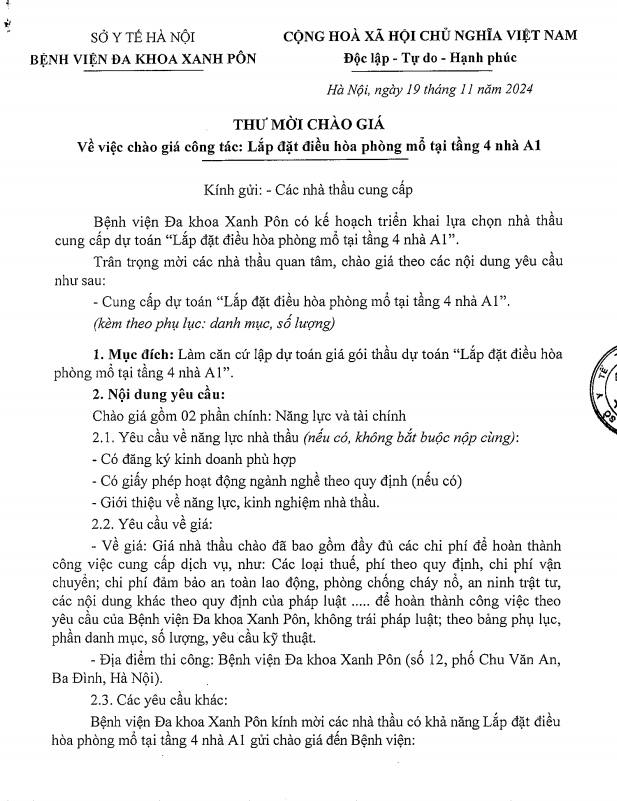 Mời chào giá lắp đặt điều hòa phòng mổ 19-11-2024