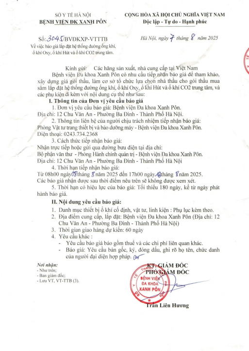 Mời chào giá lắp đặt hệ thống Oxy, CO2 trung tâm 3045-2025
