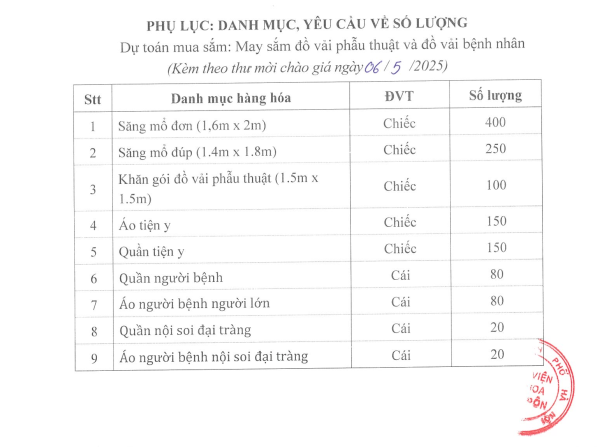 Mời chào giá may sắm đồ vải phẫu thuật và đồ vải bệnh nhân 6-5-2025