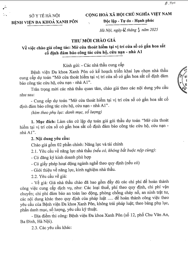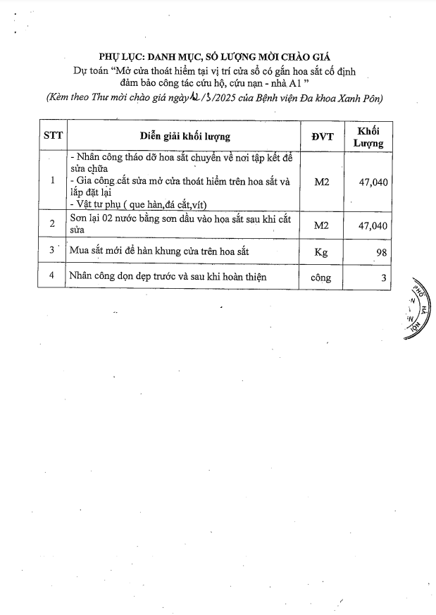 Mời chào giá: Mở cửa thoát hiểm tại vị trí cửa số có gắn hoa sắt cố định nhà A1 - 12/3/2025