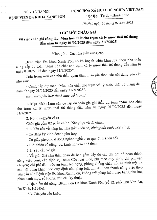 Mời chào giá mua hóa chất cho trạm xử lý nước thải 6 tháng đầu năm 2025