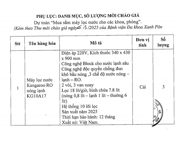 Mời chào giá mua máy lọc nước cho các khoa phòng 25-3-2025