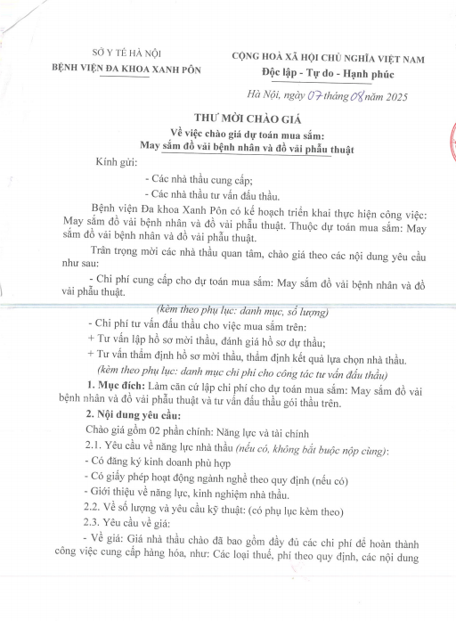 Mời chào giá mua sắm đồ vải bệnh nhân và đồ vải phẫu thuật 07-08-2025