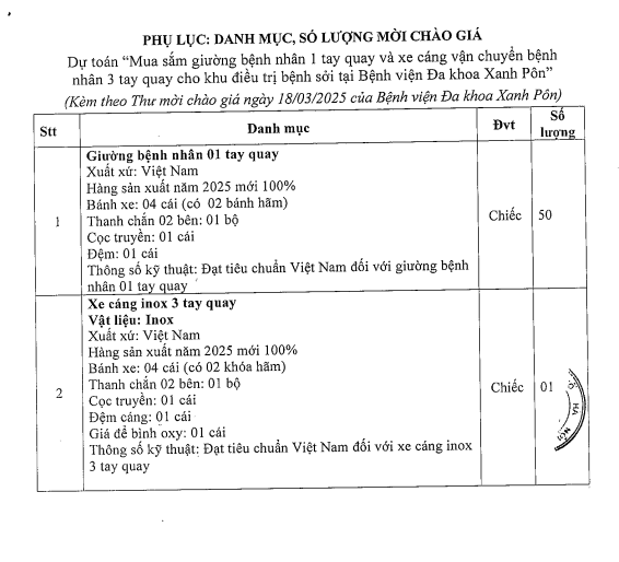 Mời chào giá mua sắm giường bệnh nhân 1 tay quay và cáng vận chuyển 3 tay quay 18-3-2025
