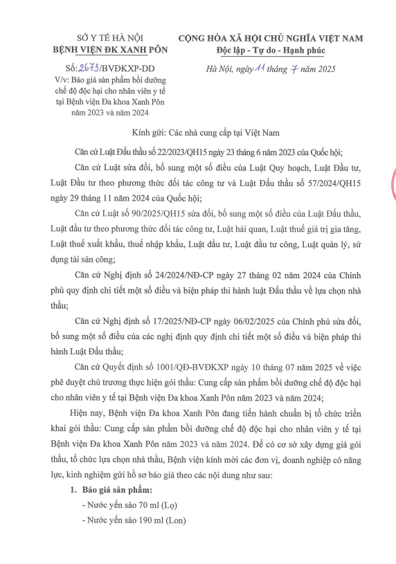 Mời chào giá sản phẩm bồi dưỡng chế độ độc hại 2673-2025