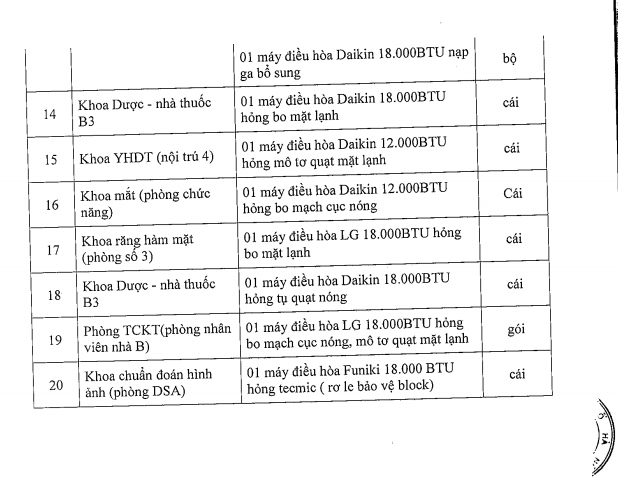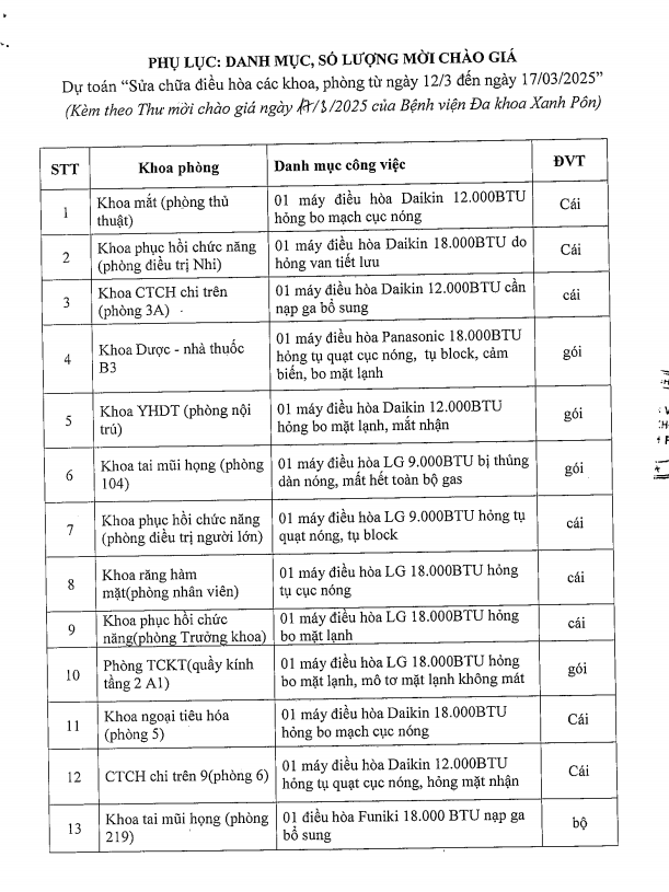 Mời chào giá sửa chưa điều hòa các khoa phòng từ 12-3 đến 17-3-2025
