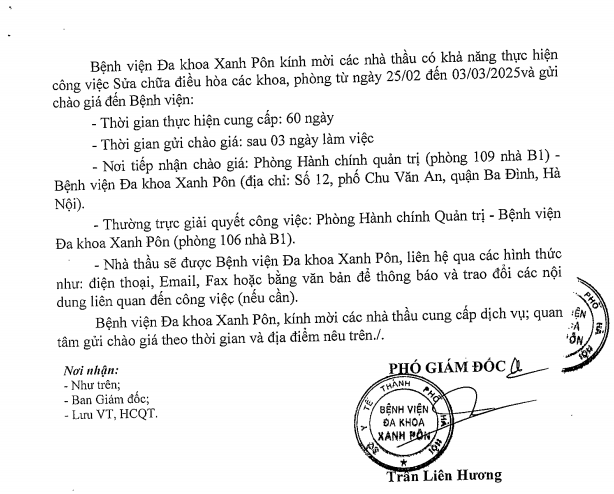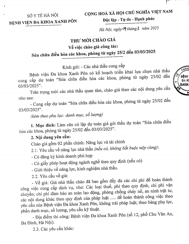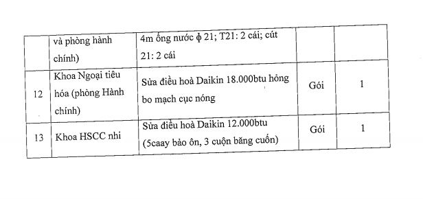 Mời chào giá sửa chữa điều hòa các khoa, phòng từ ngày 25/2 đến 3/3/2025