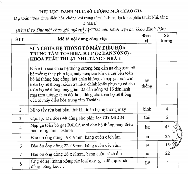 Mời chào giá sửa chưa điều hòa trung tâm Tosiba tầng 3 nhà E 9-4-2025