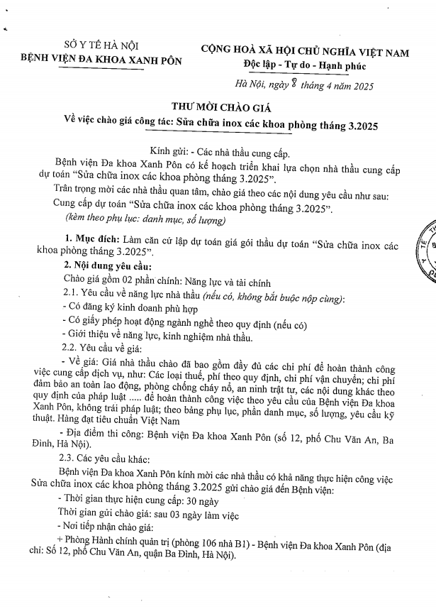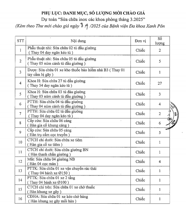 Mời chào giá sửa chữa inox các khoa phòng tháng 3-2025