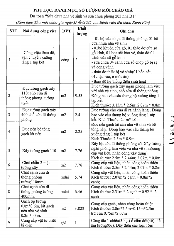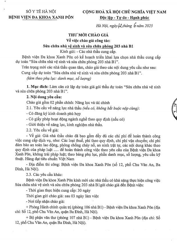 Mời chào giá sửa chữa nhà vệ sinh và sửa phòng 203 nhà B1 12-06-2025
