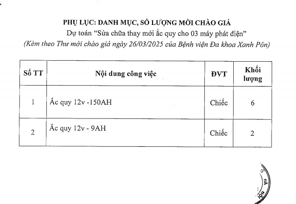 Mời chào giá sửa chữa, thay mới ắc quy cho 03 máy phát điện 26-3-2025