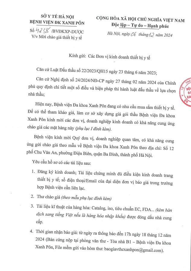 Mời chào giá thiết bị y tế 4238-2024