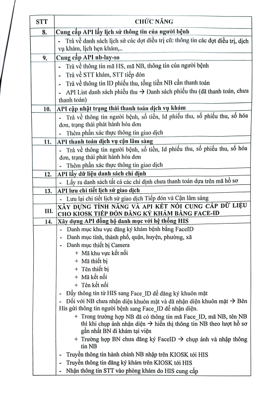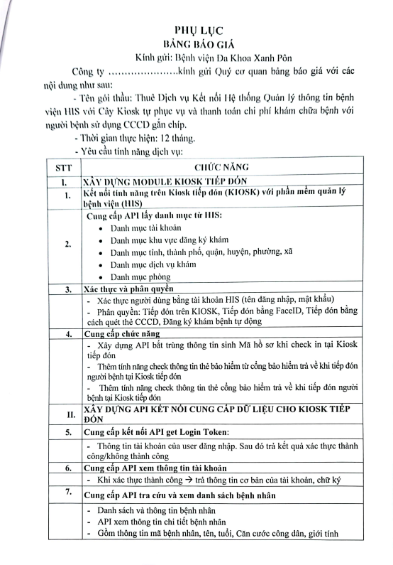 Mời chào giá - Thuê Dịch vụ Kết nối Hệ thống Quản lý thông tin bệnh viện HIS với Cây Kiosk - 2025
