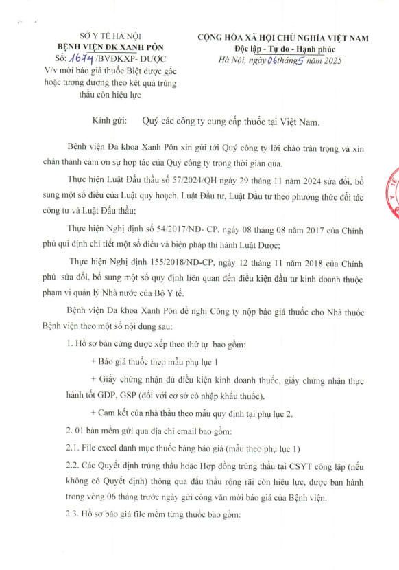 Mời chào giá thuốc Biệt dược gốc hoặc tương đương 1674-2025
