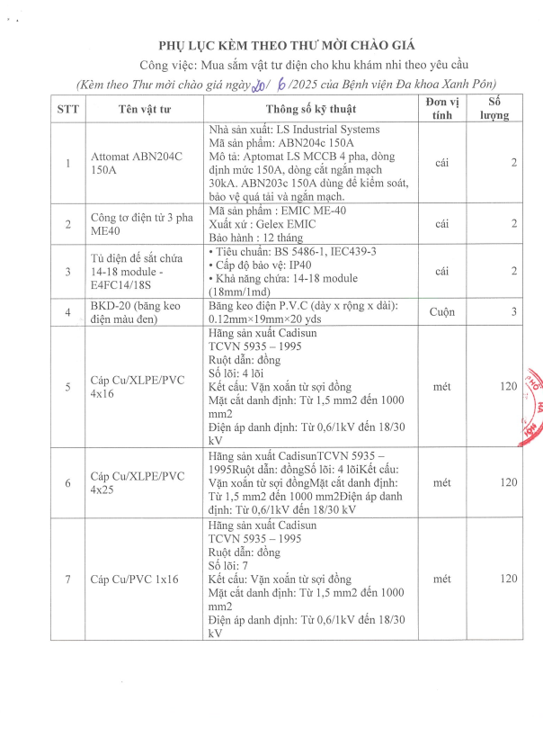 Mời chào giá vật tư điện cho khu khám nhi 20-6-2025
