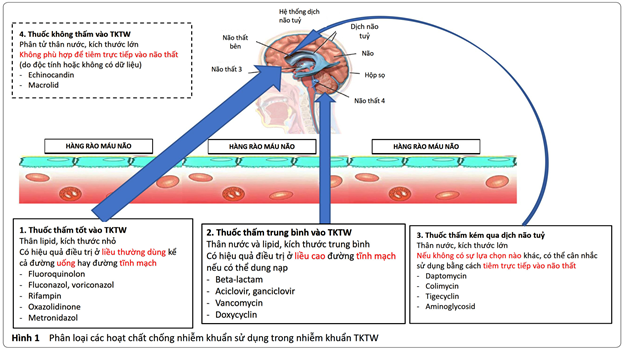 Trong điều trị nhiễm khuẩn thần kinh trung ương, việc tối ưu phác đồ để kháng sinh có thể tới được thần kinh trung ương (TKTW) là vô cùng quan trọng bởi: (1) não bộ là một cơ quan ít chịu ảnh hưởng của phản ứng miễn dịch, bình thường không có bạch cầu trong nhu mô não và dịch não tuỷ (DNT); (2) hàng rào máu não (HRMN) khiến kháng sinh hầu như không thể thấm vào TKTW.