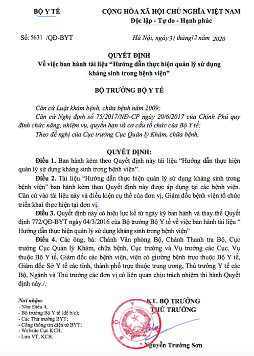 Ngày 31 tháng 12 năm 2020, Bộ Y tế ra Quyết định số 5631/QQĐ-BYT về việc ban hành tài liệu “Hướng dẫn thực hiện quản lý sử dụng kháng sinh trong bệnh viện” thay cho Quyết định 772/QĐ-BYT ngày 4/3/2016.