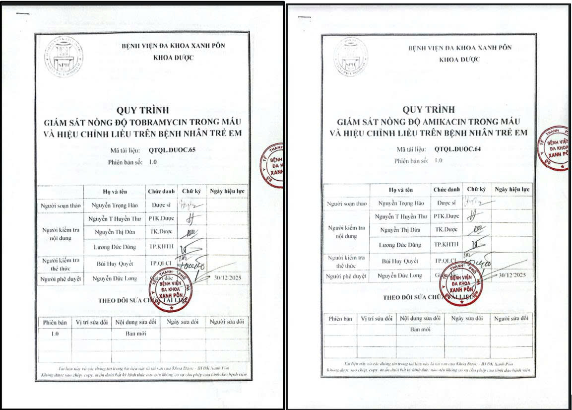 Sau khi được Hội đồng chuyên môn thẩm định và Ban Giám đốc bệnh viện phê duyệt, quy trình TDM aminoglycoside trên bệnh nhân nhi đã chính thức được ban hành và áp dụng trong thực hành lâm sàng tại các khoa điều trị.
