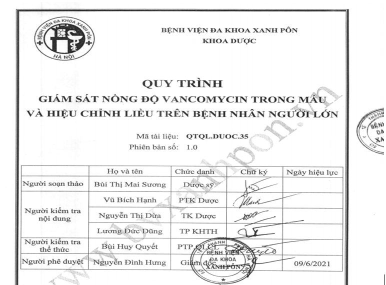 Hướng dẫn đồng thuận mới nhất của Hội truyền nhiễm Hoa Kỳ (IDSA) năm 2020 chỉ ra, để tối ưu hóa hiệu quả cũng như giảm thiểu độc tính của vancomycin (thận và tai), giá trị đích PK/PD (dược động học/ dược lực học) của vancomycin (AUC24/MIC) cần đạt trong khoảng 400-600 mg.h/l và khuyến khích theo phương pháp tiếp cận Bayesian [1]. Bệnh viện Đa khoa (BVĐK) Xanh Pôn đã cập nhật những hướng dẫn mới nhất của IDSA 2020 và ban hành, triển khai “Quy trình giám sát nồng độ (TDM) vancomycin trong máu và hiệu chỉnh liều trên bệnh nhân người lớn” trong thực hành lâm sàng thường quy bắt đầu từ tháng 06/2021.