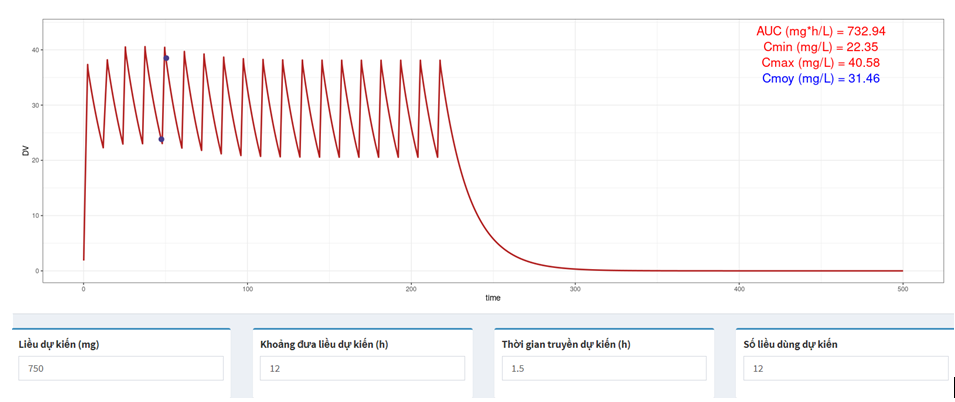 Ngày 10/7/2021, bệnh nhân được lấy mẫu TDM ở liều duy trì thứ 4, với kết quả định lượng nồng độ đỉnh Cpeak = 38,5 mg/ml và nồng độ đáy Ctrough = 23,82 mg/ml, độ thanh thải creatinin (Clcr) tại ngày định lượng là 56,7 ml/phút (ước tính theo công thức Cockcroft – Gault). Các giá trị này được đưa vào và tính toán bằng phần mềm mã nguồn mở được xây dựng dựa trên dữ liệu dược động học quần thể của bệnh nhân sử dụng vancomycin tại BVĐK Xanh Pôn, cho giá trị AUC24/MIC là 733 mg.h/l, cao hơn đích PK/PD mong muốn. Bệnh nhân được hội chẩn chỉnh liều vancomycin: 500 mg mỗi 8 giờ, với giá trị AUC24/MIC dự đoán là theo phần mềm là 499 mg.h/l.