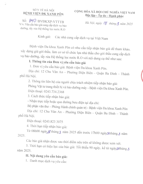 Yêu cầu báo giá dịch vụ bảo dưỡng tẩy rửa hệ thống lọc R.O 840-2025