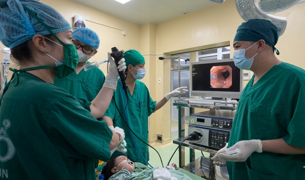 Ngay sau khi đánh giá tình trạng ban đầu, các bác sĩ đã chỉ định nội soi phế quản cho bệnh nhân. Đây là thủ thuật rất quan trọng và gần như là “tiêu chuẩn vàng” trong đánh giá bệnh nhân bỏng đường hô hấp do hỏa hoạn. Giá trị nội soi không chỉ ở chẩn đoán mà còn ở tiên lượng và điều trị. Bệnh nhân nhanh chóng được làm sạch đường thở, loại bỏ khói bụi và dịch tiết gây cản trở hô hấp, đánh giá tổn thương bỏng đường hô hấp do hít khói, muội than và khí độc, khí nóng. Việc can thiệp thủ thuật nội soi phế quản ống mềm được thực hiện kịp thời đã giúp cải thiện rõ rệt tình trạng hô hấp của các bệnh nhân, đáp ứng điều trị tích cực.