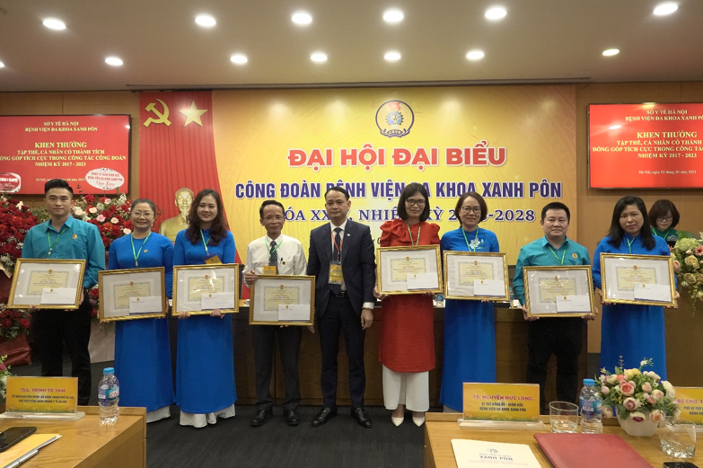 Lãnh đạo Công đoàn ngành Y tế Hà Nội và lãnh đạo Bệnh viện Đa khoa Xanh Pôn tặng hoa chúc mừng Ban Chấp hành Công đoàn Bệnh viện khóa mới.