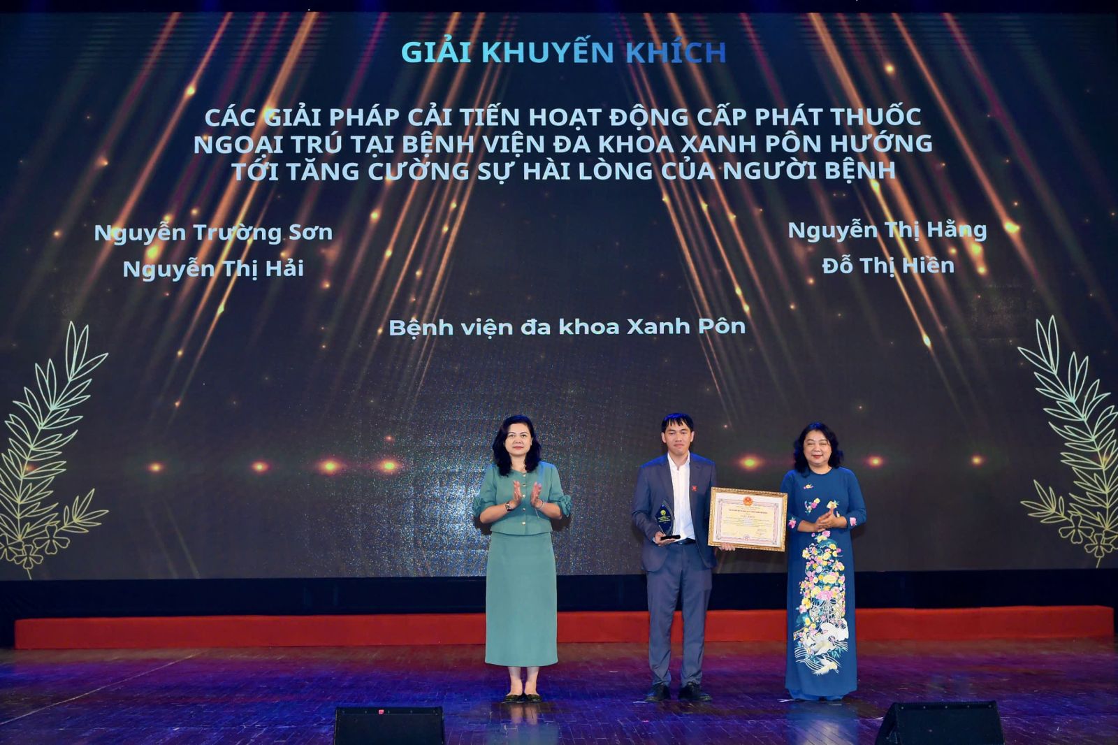 Không chỉ dừng lại ở lĩnh vực chuyên môn kỹ thuật, Bệnh viện Đa khoa Xanh Pôn còn được vinh danh với đề tài "Các giải pháp cải tiến hoạt động cấp phát thuốc ngoại trú tại Bệnh viện Đa khoa Xanh Pôn hướng tới tăng cường sự hài lòng của người bệnh" do Khoa Dược thực hiện.